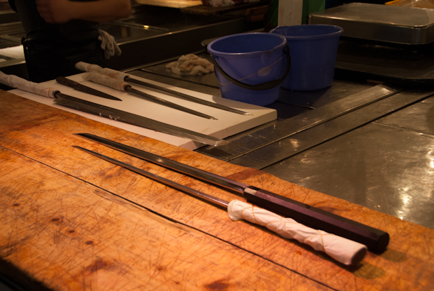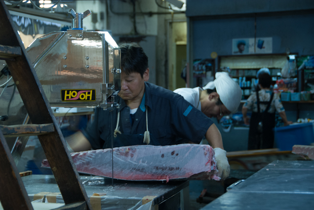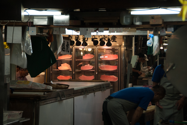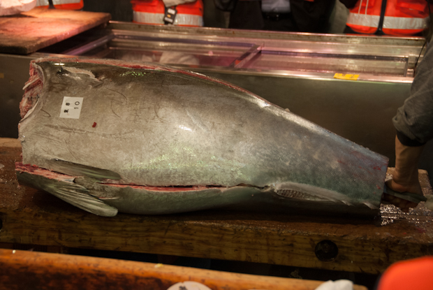 Then we meet a group of people dressed in bright orange vests with cameras and what appears to be a guide. We join them. We see experts cutting up tuna more than a meter long using knifes about the same length. You don’t want to get in the way. Everything happens really fast.