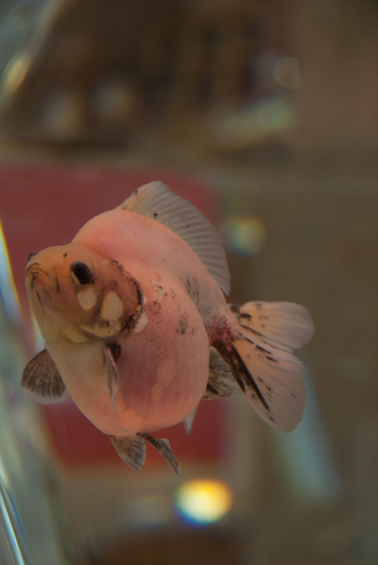 Just behind the entrance to one of the more luxurious shops well fed gold-fish swim in the crystal clear water of a huge glass bowl.