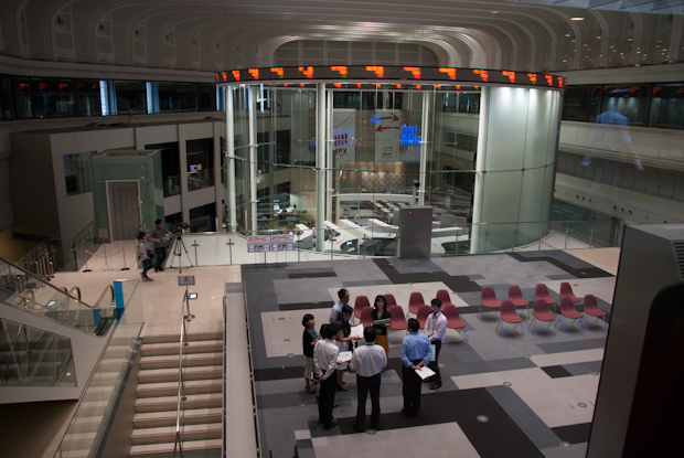 On the map I see that the Tokyo Stock Exchange is close by. A friendly guard addresses me without a word when I walk right through the front door. He shows me a sign-board. It depicts a rectangle with a cross at the lower side and an arrow that goes from there around the rectangle to its upper side. There I find the visitors entrance. I pass through a metal detector. The two young women at the desk do not speak English. At the Tokyo Stock Exchange? They hand me a visitors badge.