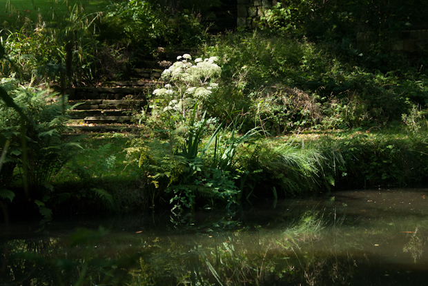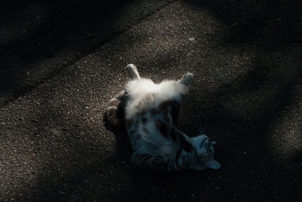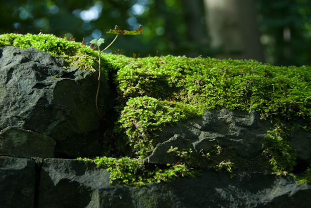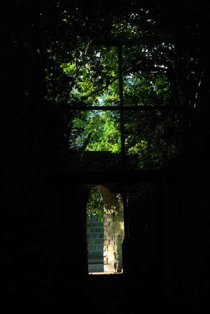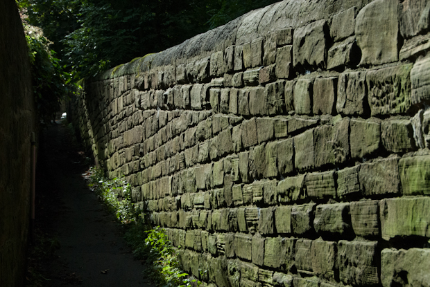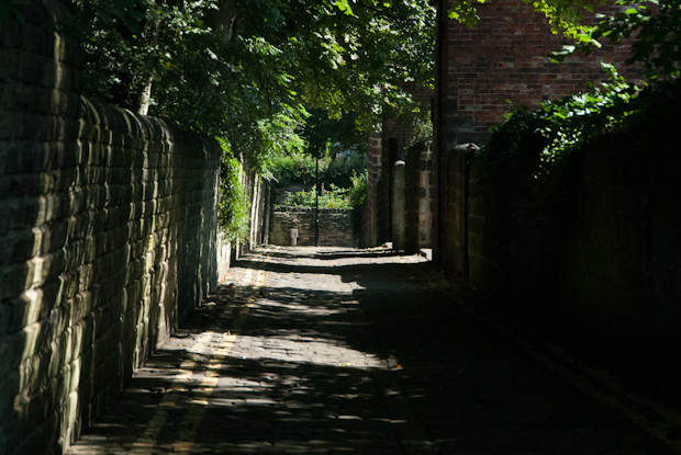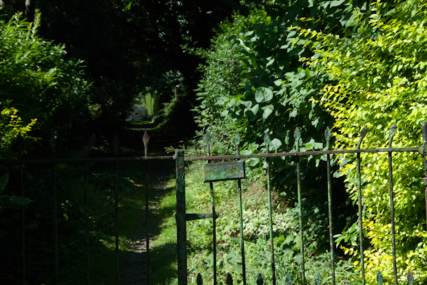 I walk through narrow passages, shaded by trees.