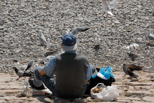 Sea gulls and pigeons join the crowd.