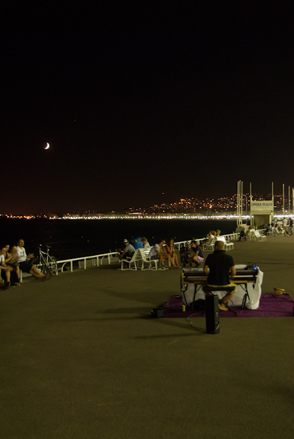 When the sun goes down I walk back. Piano music floats along the promenade …