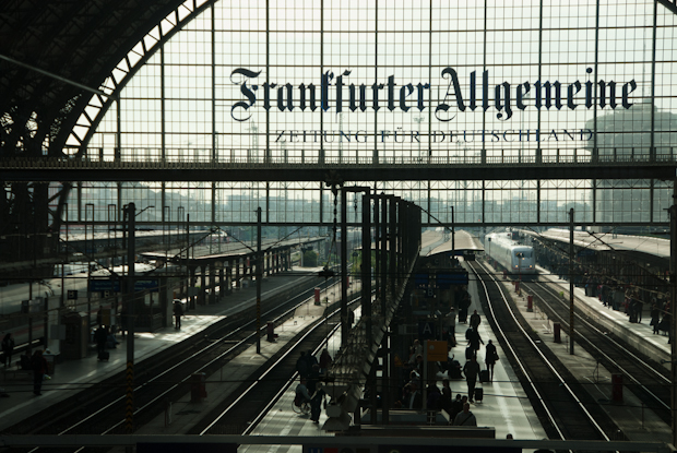 I have to switch trains in Frankfurt. Commuters flood from the coaches onto the platforms. Colours seem to be reserved for billboards.
