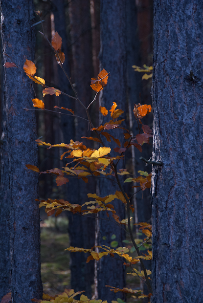 Through the trees sun light filters on autumn leaves.