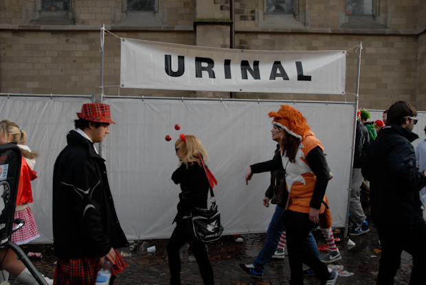 The concept is interesting. People urinate against a tarp. Gravity takes over. Eventually the constant flow will find a sewer somewhere. The people close by don’t seem to mind.