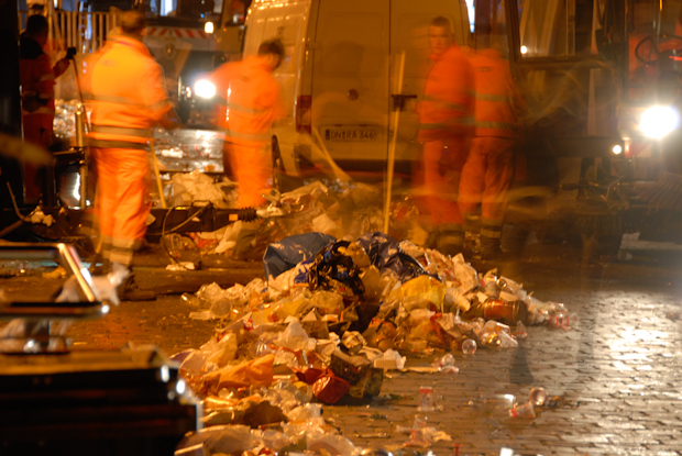 In the side streets the hungry take their late meal.