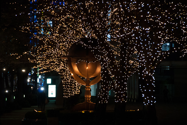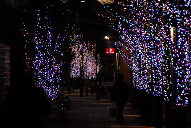 The sun is setting soon, and I decide to follow the tracks to Shinjuku, on foot. I have travelled this route many times by train, but I have no idea what lies in between. I want to find out. At my local station the trees are draped in lights where leaves are missing.