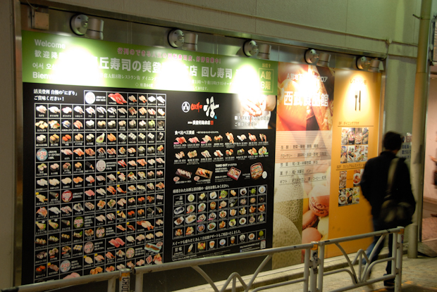 I sit down in front of two rails and a touch screen. Trays with sushi, cake, soup or beer rush by on the rails. My fingers order two sushi dishes. This time the tray stops right in front of me.