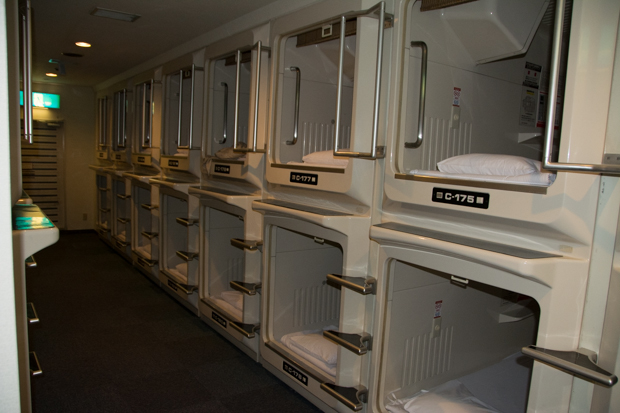 I stop in Osaka for the night. Time to experience a capsule hotel. I have to sign a form with the house rules on it. There is a penalty on taking any luggage into the capsule. I have to store it in a locker. When I open the locker I find a pyjama. I get it: I am supposed to wear it during my stay. My clothes too go into the locker.