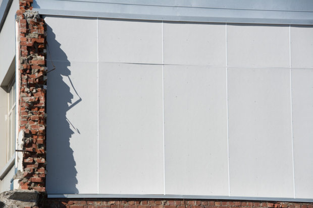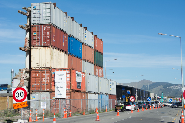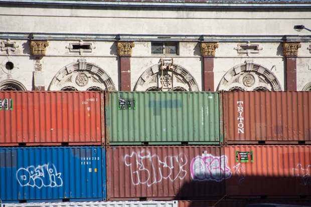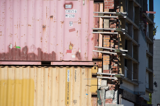 Facades hide behind container walls. I guess, to protect pedestrians in case of a final collapse.