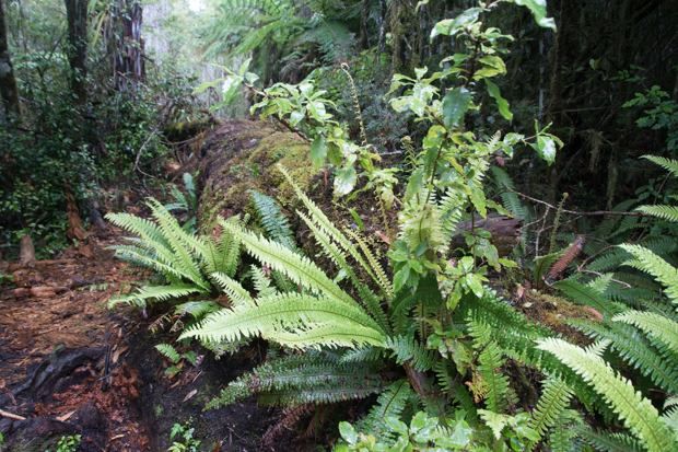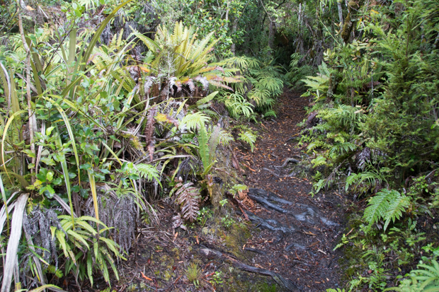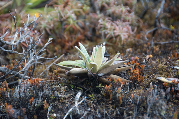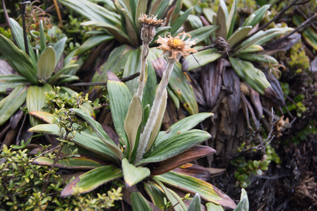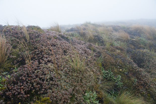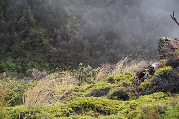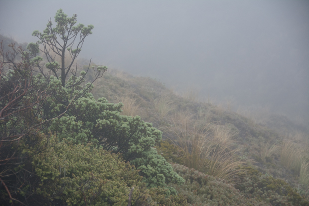 The rest of us start to climb. It does not get better. It gets worse. Crouched into the shelter of a volcanic cliff I stuff everything that is sensitive to water into a plastic bag, inside my backpack. I have no illusions what is to come. I ascend in horizontal rain. The panoramic view is reduced to a few meters; barely enough to find the next sign post that marks the track.